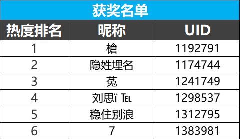 恭喜以下玩家获得本次活动奖励,具体名次和名单如下: