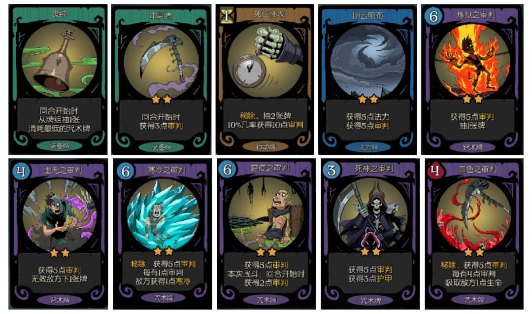 【丧钟】抽死神降临非常稳健。【审判者】聊胜于无。【死亡怀表】强力过牌,还有几率恢复审判。【阴云密布】可以替换普通回蓝。【炼狱之审判】带过牌,推荐。【其他审判卡】根据自己喜好和卡组优缺点决定,比如汲取卡多的话就可以选输出型。除了血色有点鸡肋,其他都可以用用,有大难临头的话不用带太多,建议2张以内。