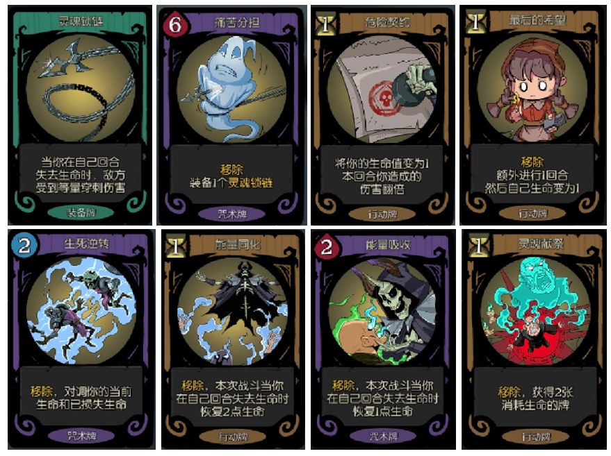 【消逝】稳定的吸血牌。【魂引灯】基础装备,稳定汲取。【摆渡】汲取流强力过牌。【通灵术】效果翻倍,增伤神器。【冥界引路人】随机看脸。【灵魂收割】核心输出牌,利用各种伤害翻倍叠加输出非常可观。【招魂水晶】【招魂术】汲取+过牌。【能量流动】最好带一张,空蓝时候可以作为启动牌。