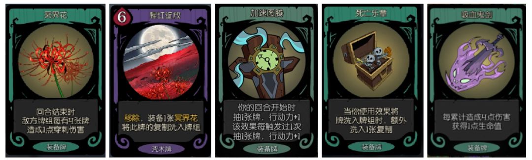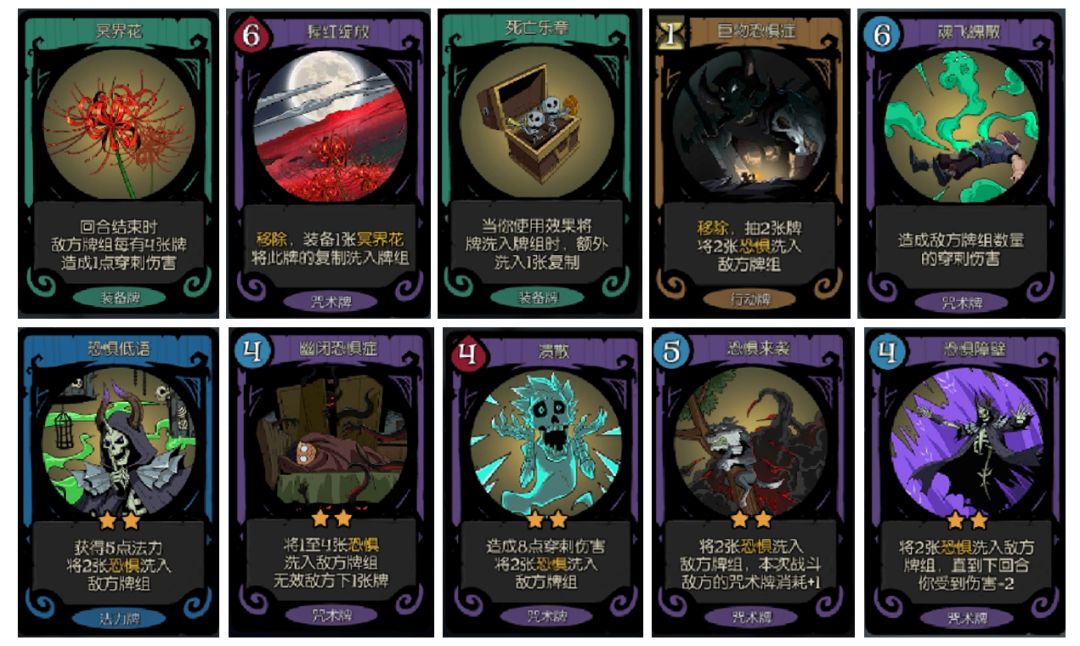 【冥界花】基础装备。【猩红绽放】复制冥界花用。【死亡乐章】可以多塞恐惧,强度暴增。【巨物恐惧症】过牌+塞屎。【魂飞魄散】强力输出,需要积累,适合打持久战。【恐惧低语】替换普通回蓝。【各种恐惧咒术牌】根据情况而定,最好以保证续航为主要思路,推荐【恐惧屏障】【幽闭恐惧症】这类免伤或者限制卡。【恐惧来袭】能一定程度上削弱有回蓝技能的怪,但如果有祝福【死亡凝视】的话,最好不要再带恐惧来袭,意义不大。