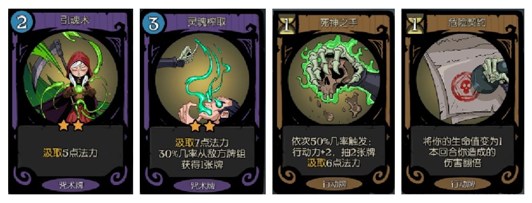 【危险契约】生命值变成1,伤害翻倍,然后再吸回来。毕竟汲取流没啥输出,只要能吸回来,何乐而不为。【引魂术】初始牌,凑合用。【灵魂榨取】没有其他汲取卡或者有死神硬币可选。【死神之手】行动力过剩或者有死神硬币可选。