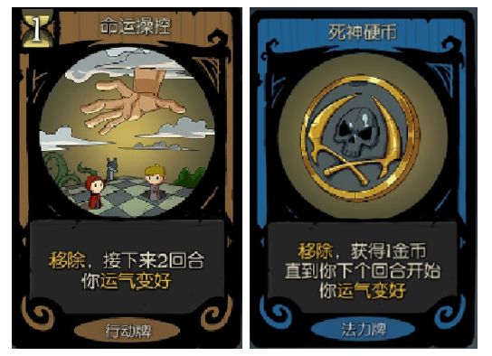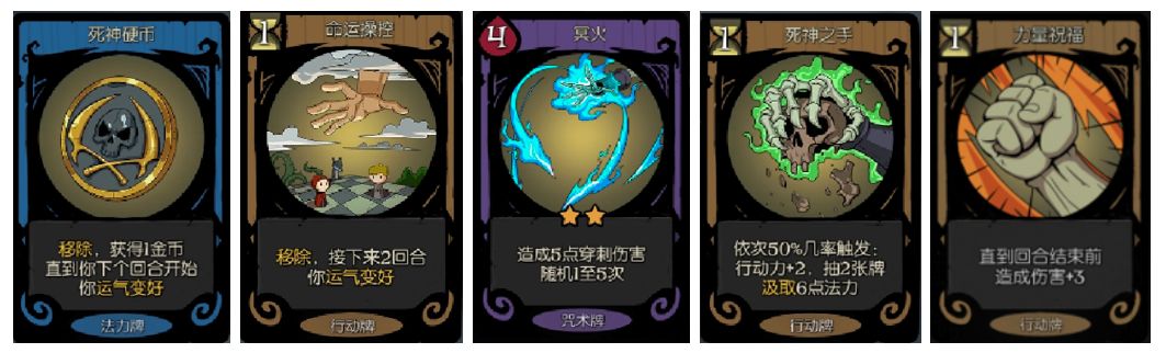 【死神硬币】【命运操控】运气加满(好运的回合可以叠加,行动力充足的情况下可以提前把命运操控全部打出)。【冥火】稳定输出打5*5多段伤害,前期就能拿到,降低过渡难度,配合增伤卡和2技能输出可观。【死神之手】过牌+吸蓝+行动力,必拿。【力量祝福】偷蛙王或者石中剑,石中剑可以无限偷,强烈推荐多刷几张。我刷了两张,打狼王3回合。