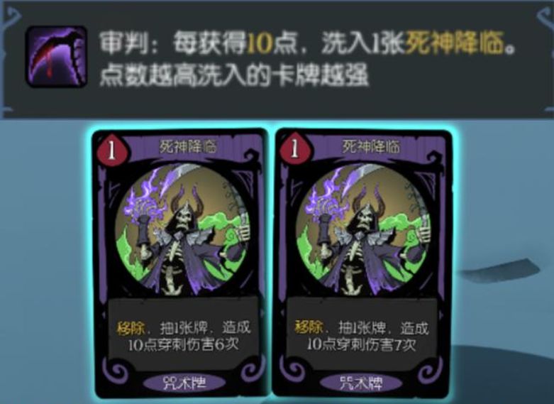 审判流应该是契约师的主流玩法了,从初始装备就能看出来,审判层数每叠加10层就会获得一张死神降临,比如叠加到60层就会获得一张可以打6次10点伤害的【死神降临】以此类推。