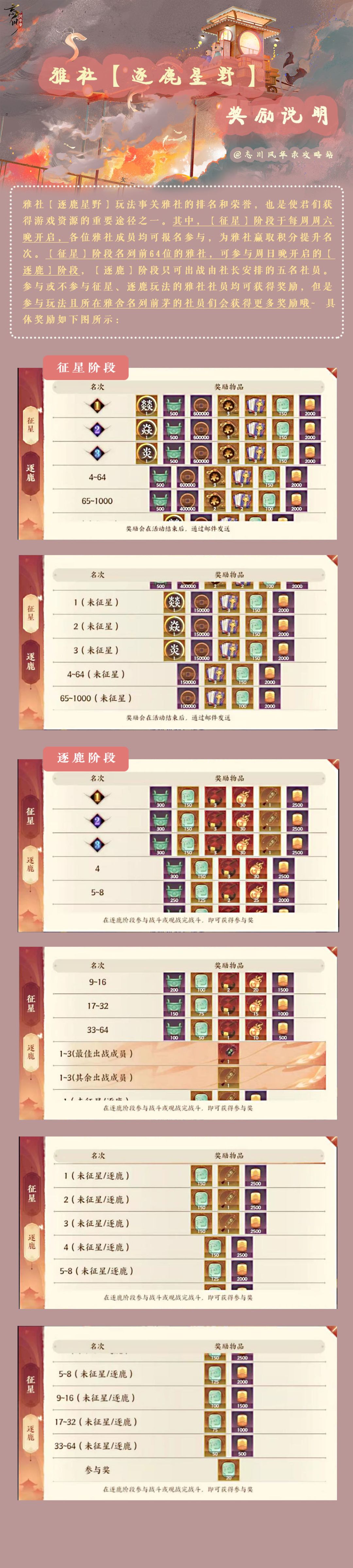 雅社【逐鹿星野】玩法事关雅社的排名和荣誉,也是使君们获得游戏资源的重要途径之一。其中,【征星】阶段于每周周六晚开启,各位雅社成员均可报名参与,为雅社赢取积分提升名次。【征星】阶段名列前64位的雅社,可参与周日晚开启的【逐鹿】阶段,【逐鹿】阶段只可出战由社长安排的五名精英社员。参与或不参与征星、逐鹿玩法的雅社社员均可获得奖励,但是参与玩法且所在雅舍名列前茅的社员们会获得更多奖励哦~
