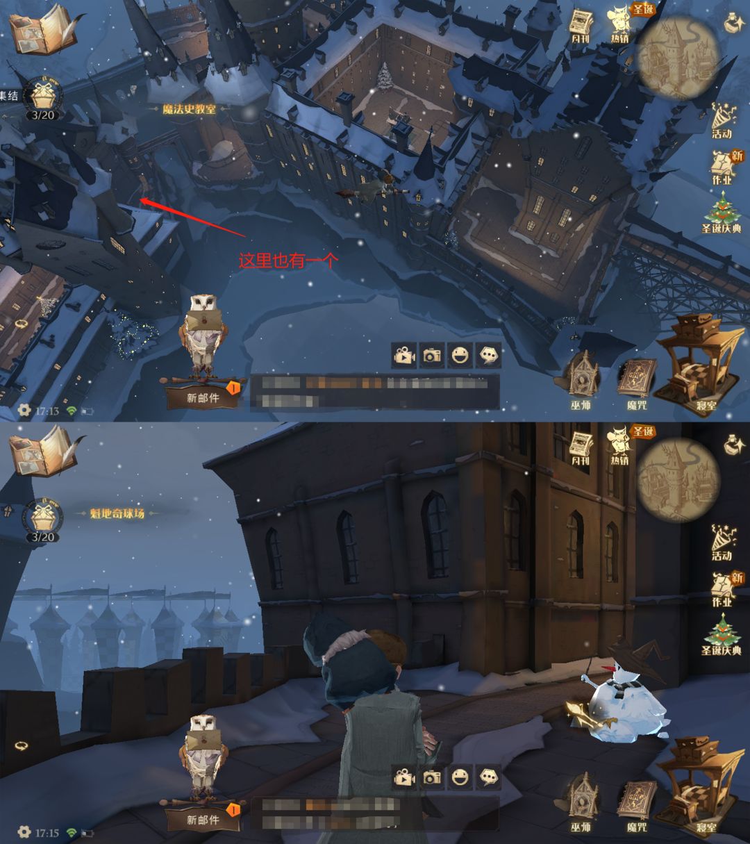 - 靠近禁林的那边的回型广场(有大圣诞树),雪人在角落。