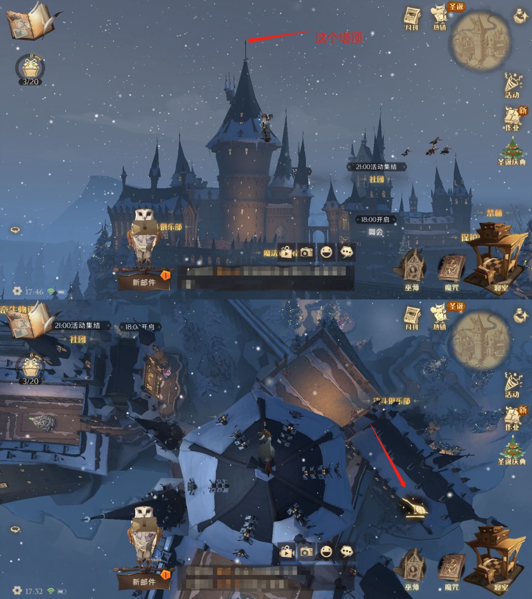 飞到【城堡主楼】最高的塔尖 - 通过拉低视角慢慢移动对准塔尖 - 可以降落至塔尖拍照 - 拍照即可获得200雪花