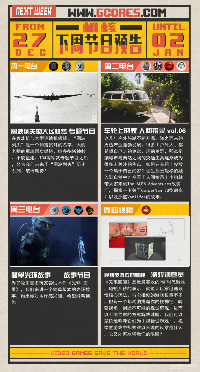 大家好!下周节目如图所示。下周是节目类型非常丰富的一周,周一大尉老师将为我们开启“图波列夫”历史系列,而周二将会有新的一期《人间拾录》节目,周三的《光环》故事节目将会让更多不熟悉这个系列的同学来入坑,而周四小五将在他的这一期《游戏调查员》中跟我们聊聊视错觉游戏的奥秘。除此之外,下周还会固定更新《天天ACG》和《游戏新闻》节目。祝大家圣诞快乐!