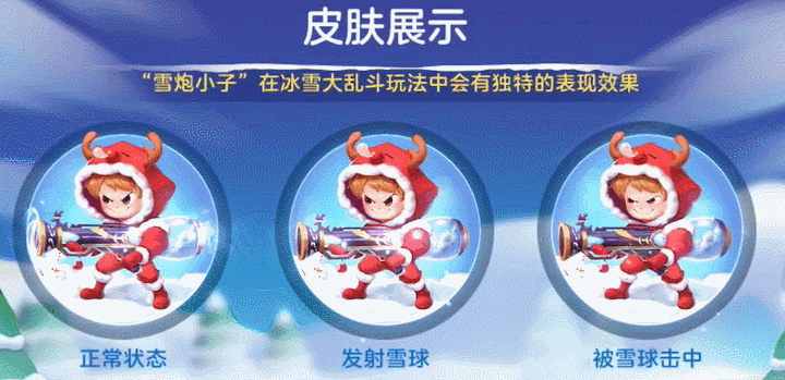 全新圣诞皮肤“雪炮小子”在冰雪大乱斗玩法中,正常状态、发射雪球和被雪球击中会有独特的表现效果哦,还可以解锁专属孢子·雪球爆弹等超多福利!