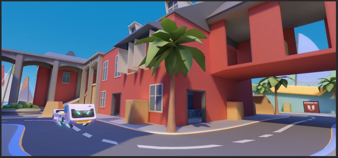 酒桶镇是护送运载模式的第一张地图,目前还是白模阶段。在这张地图中,我们尝试了更加立体以及更具有区域战斗特征的关卡设计方式。护送车辆的动态变化会给选手们带来非对称对抗体验,非常考验大家的团队配合与攻防策略博弈。同时,酒桶镇也是目前面积最大的一张地图,拥有丰富的可交互对象与可选择路线,大家可能需要多花一些时间才能熟悉这个新赛场噢~