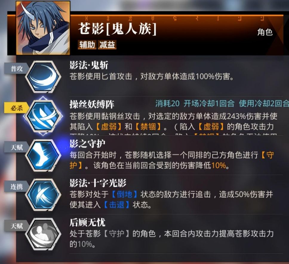 苍影使用黏钢丝攻击,对选定的敌方单体造成243%伤害并使其陷入[虚弱]和[禁锢]。这个技能可以大大降低我方对输出强度的要求(如果你的队伍中输出类角色的伤害不足,可以考虑辅助配苍影)