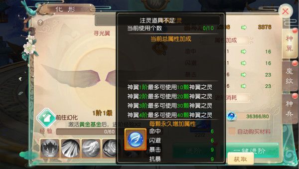 1、神翼消耗天羽道具和灵力获得进阶经验值,进阶经验值满升级成功并提高角色属性,每升10级将提高1阶。
