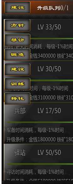 训练场。70军事的可以升一级,其余情况都不建议升级!!!升级之后每级消耗增加10万,收益只增加10%!4.1版本后可以锁0级训练场了,不过高级资源需要太多,还是浪费。