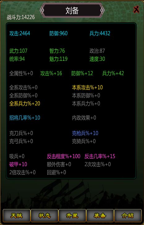 2、武将升到6星后,天赋技能触发。绿字属性,不论在什么位置都会触发。黄字属性,只有在固定位置触发。也就是说刘备只有在中军的时候才能触发全体兵力加成和招降将领几率。(4竖列从左到右是骑、弓、枪、盾,3横排是前中后)