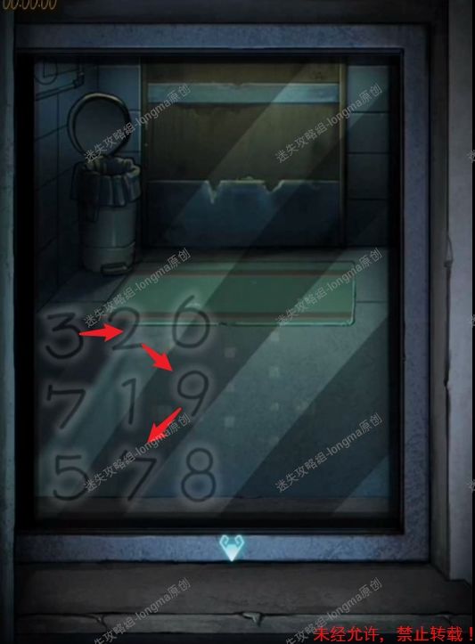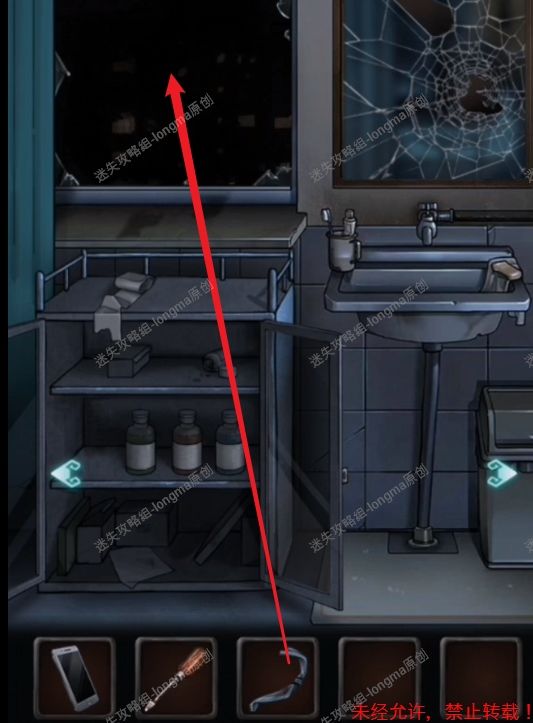 56.向右来到有水池的房间,拉开窗帘,点击水池上面的镜子和左边的窗户,对比两个图案,得出手机密码:3297。56 56.1