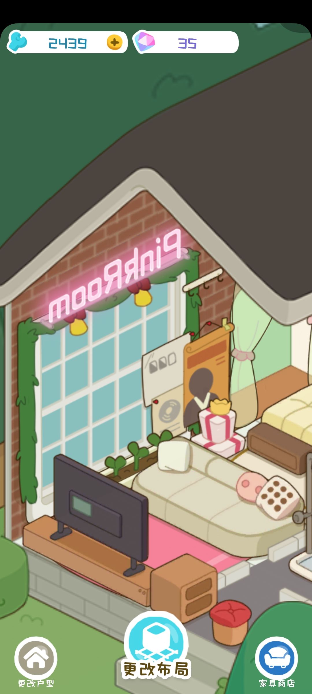 卧室有部大电视,平时可以坐在宽敞的沙发或者柔软温暖的地毯是打电动,最左边可以看到种植了一些绿色植物,打累了可以看看眼睛休息(并不,还有一个大大的落地窗,植物与圣诞饰品点缀,上面还挂着一个霓虹灯,给沉闷的砖墙带来一点