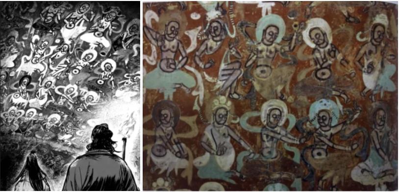 A:其实答案非常简单—最震撼的艺术已经被我们的前辈们在数千年前就已经展现出来了。在原作里,许先哲很大程度的还原了壁画通道的震撼感,如刀马一行在拜访尉迟恭时所通过的那一条壁画通道,里面绝大多数的壁画画像都有对应的艺术原型。