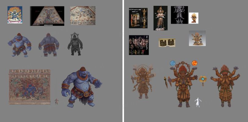 A:当然了!最简单粗暴的就是对于游戏中小怪和BOSS的设计!我们索性就“原汤化原食”,用壁画中的人物模型来作为大小BOSS和一般野怪的角色原型,让每位镖客大人在刷怪的过程中,都可以体会到这种独特的美术风格的震撼。