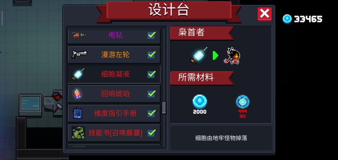 携带宠物夜歌进入地牢,杀死小怪获得细胞999个后在设计图制作“细胞凝液”,携带进入地牢即可变为枭首者。