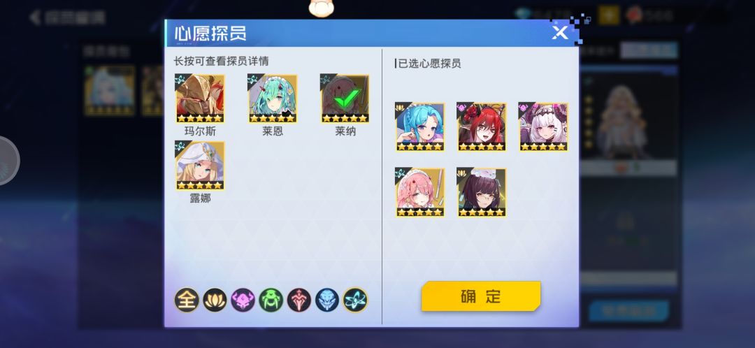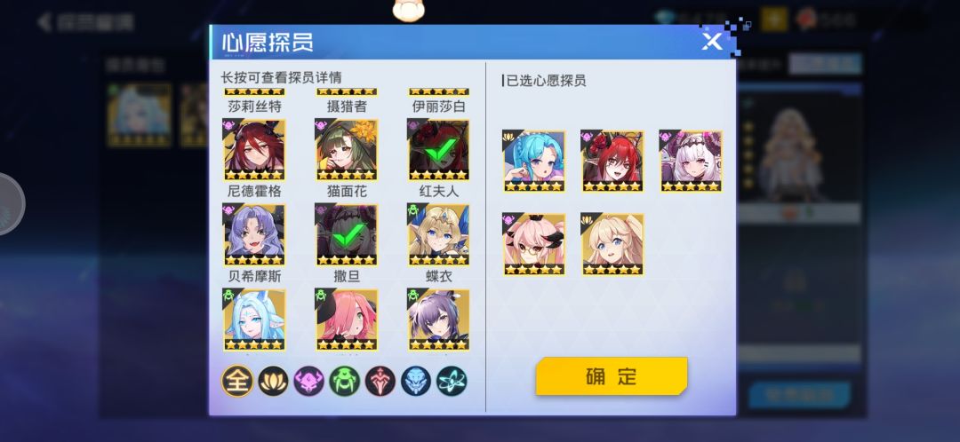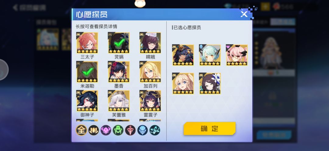 一个三个图嘛,按排序从上往下分为①、②、③。心愿探员是只能选五个的,但是要上阵六个角色,所以在你这五个心愿中,哪个先满了九星,你就可以把他替换补第六个心愿探员。