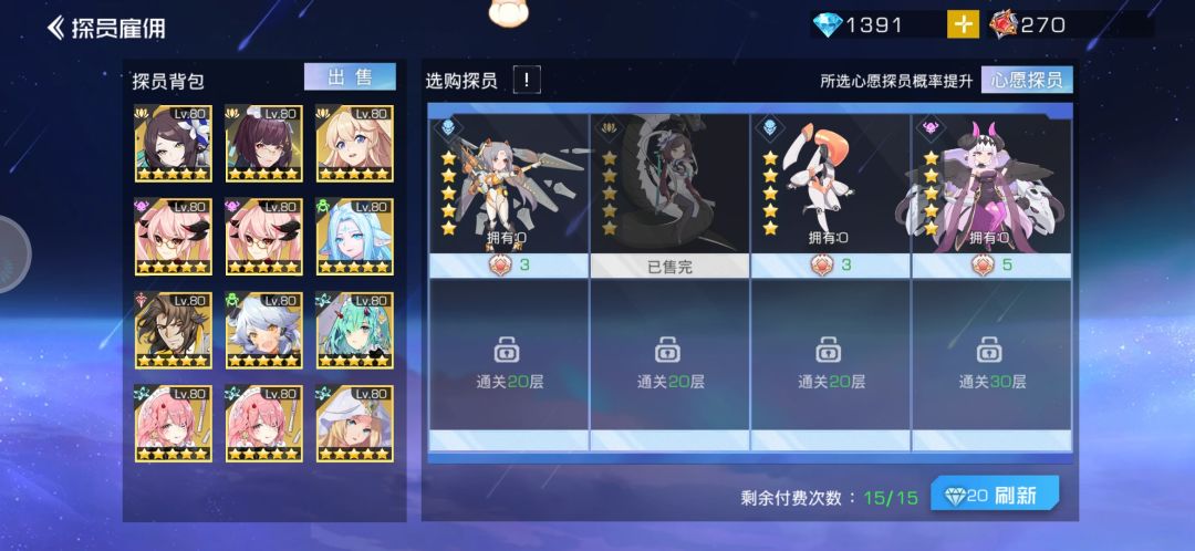 它本来只有三格,第四个格子要通关第五层开启,第4、5、6格子通关20层开启。这代表,你第一天,可以用最少的次数(我用了免费五连)通关到了第五层才开始刷。那我是不是比你们刷出来更多,心愿探员概率更高?同理15→20层那天也是,你可以先通关了20层再继续刷新探员!解锁15→20我不刷新打不过怎么办,助力啊!每一层都助力,助力到20层再开始刷!