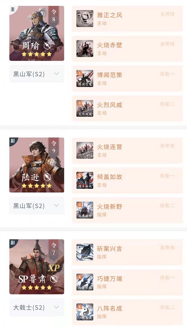 该体系中仍然需要周瑜主将技的前置焚烧,所以SP鲁肃的定位为辅助,推荐巧捷万端+八阵名成,前者配合队内高频的主动技能释放叠加增伤并对敌减伤,后者保证己方开场优势,可以根据PVP环境更换为画地为牢、空城计等控场技能。