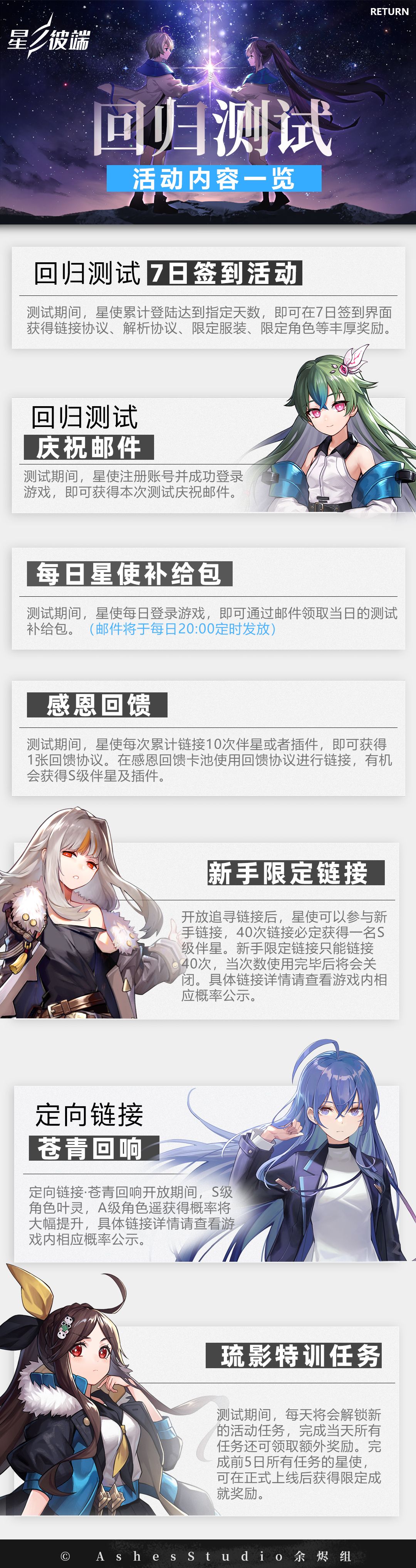 本次测试,我们为星使们准备了七日签到活动、新手限定链接、充值返还等活动,详细活动总览请查看下图。