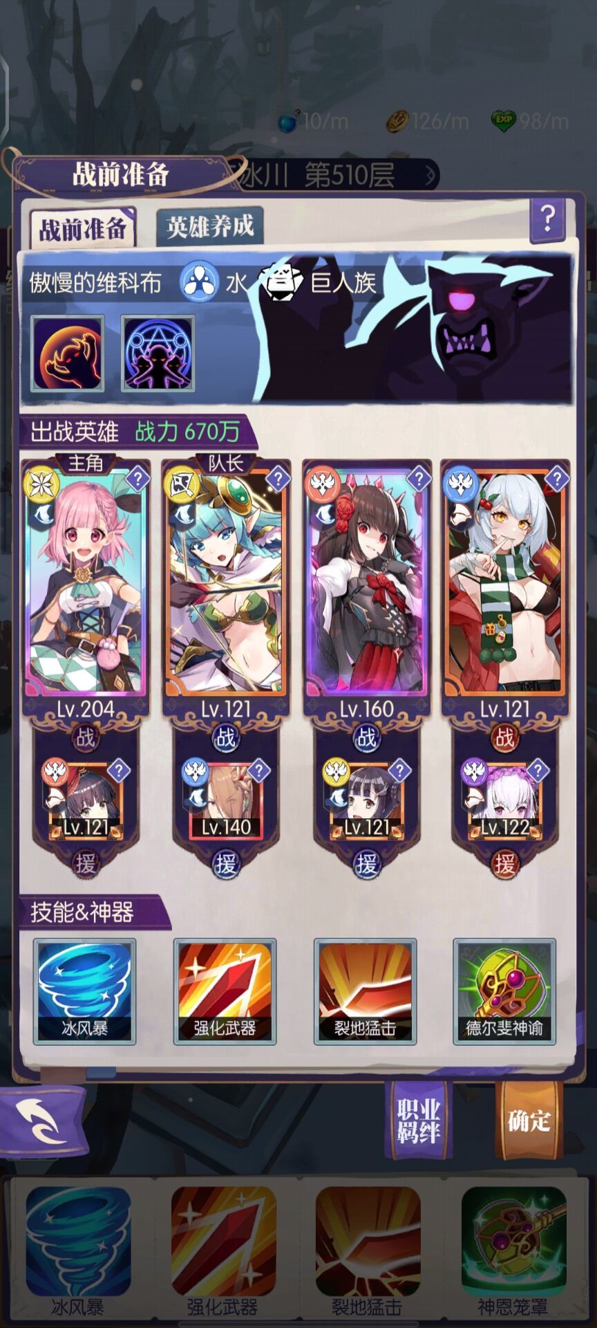 此时,你需要将你的公会卷全部拉公会币,每安装一个神语,重新打一遍公会BOSS再扫荡,目标是将主C(达芙妮或者海伦)或者底座(莫伊拉)的神语拉到8-4,相信我,你的卷绝对够用,此时你的图战应该在1200万+,没错,R2的1200万图战,你可以靠战力碾压直接上570层,在第四天晚上进入R3。