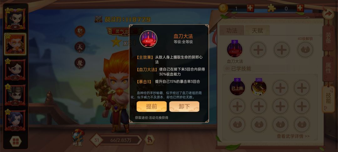 2.这游戏的所有状态会在当前回合结束后清除一个持续回合。也就是说所有的加防御的辅助技能和所有的控制技能,好用的前提是速度够快,提前出手,否则用了以后效果减半甚至等于没用。比如各种带眩晕混乱的技能,其异常状态大多只持续1回合,当前回合结束以后就消失了,比如狮子吼,天锤的自带技能等等。结论:控制技能和侠客不用带,辅助技能只有加血和加输出的技能有点用。
