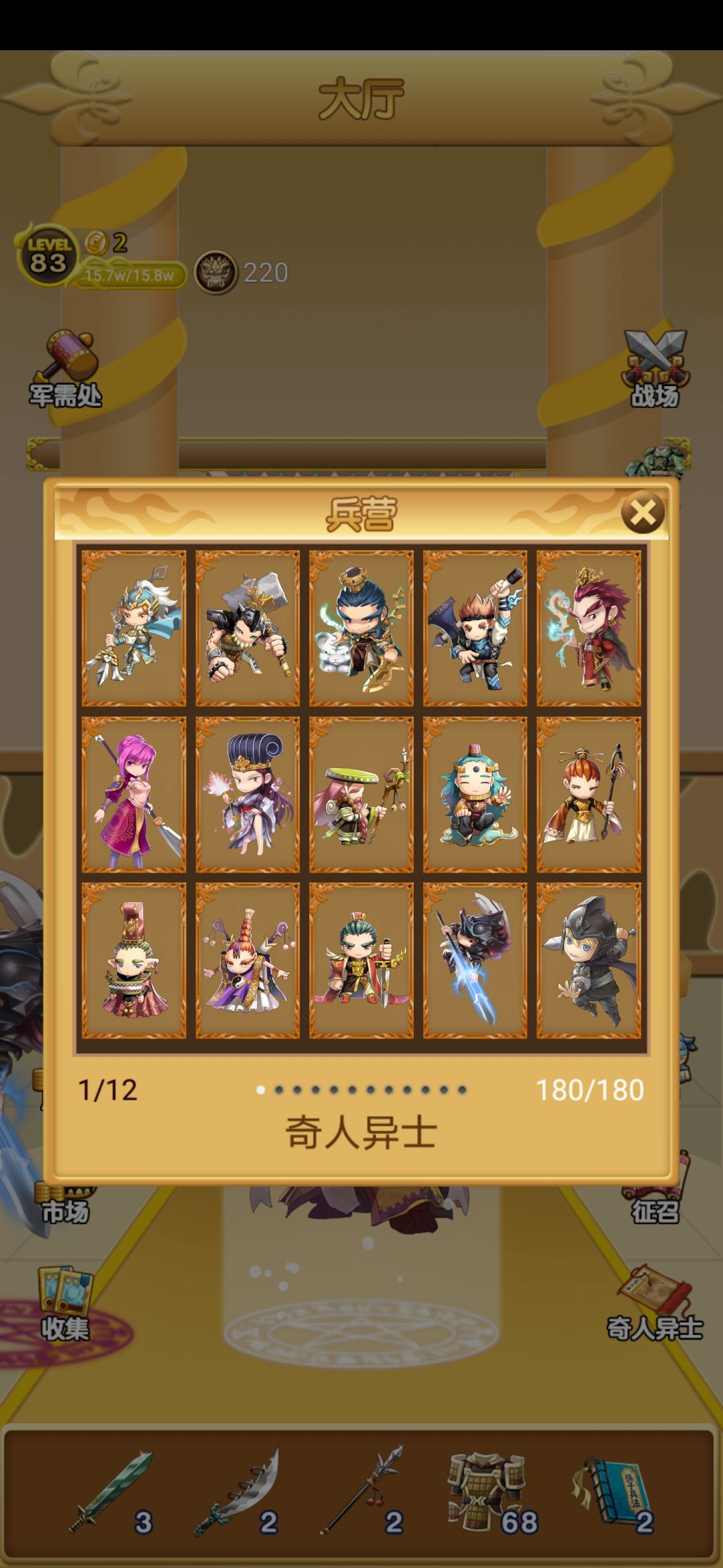 历时七天左右,纯靠看广告攒的金币。进入游戏,不用细表,先甘一波,先把姜维弄到手。游戏机制笼统得来说,就看一个招募时间,只要招募时间高的,它就是个白板也是不错的替代品!所以,在推图的路上,只要感觉将领乏力,那么就试着用一些绿篮紫替代下,当下过度用。整个推本过程,将领大约有三次稳定期!姜维,潘凤,张飞,张角,黄月英,周瑜,孙权,这些主要人物陆续弄到手后,真个本几乎就到了中期,这时试着可以打点无双,攒点精铁打造古淀刀,不多,三把就行,三件护心镜!这个估计慢者两天就搞定,这两天内,基本,你会得到曹操,黄忠,曹操,荀彧,史阿,于禁,许褚,这时期就等三把古淀刀,三件护心镜。这六件装备成型那刻起,也就宣告普通本的结束。到时就会陆续得到,王越,关羽,陆逊,太史慈,周瑜,诸葛亮!终极战力也就是太史慈,周瑜,诸葛亮,关羽(本人人品好导致普通本没过就招募到了诸葛亮,但相应的系统大大给了我脸色,导致我无双本过了两天才招募到了关羽,所以后期阵容怎么弄,我自己还是有点模糊!)大体说完,细细到来一些细节性的东西,酒不要用金币买,每次阵容更新前,记得要有一个或者两个魂伤的英雄,这样你的酒基本会留下许多。每次推本不要冒险,不然损失会很大,让你又得积累一段时间,当然在护心镜三件齐全后,可以浪,不过在有连击技能的英雄面前要克制,不然它会教你做人!看过一些帖子说魂伤的英雄血量高,回血猛,不要怕,古淀刀刀会完美的克制。至于闪避遇到的英雄,如果三件古淀刀三件护心镜做出后,可以适当做件七星剑,这样可以配合连击暴击的英雄完美的打出伤害!其实后期的本就是一个装备的应用问题,只要你用的好了,过本其实很快。遇到魂伤的就上古淀刀,连击,暴击的英雄,当然也要一个魂伤的英雄站在前排,这要可以输出最大化!遇到闪避的英雄,直接七星剑,英雄与魂伤阵容类似。遇到暴击,连击流,及残血翻倍流,直接磕药,开始硬上,阵容基本没变化,但要记住一点,只要爆出护心镜的被动,一句话,最好重新来过。无双最后一章最后两关最难打,那血是真的后,纯靠磨及考验你的人品!最后两关阵容个人认为有待考究,但三件古淀刀是必备,三件防装有待商榷。图中,我的诸葛亮觉醒技能学习错误,就没有改,因为代价太大,个人建议学习暴击!好了,祝大家游戏愉快!