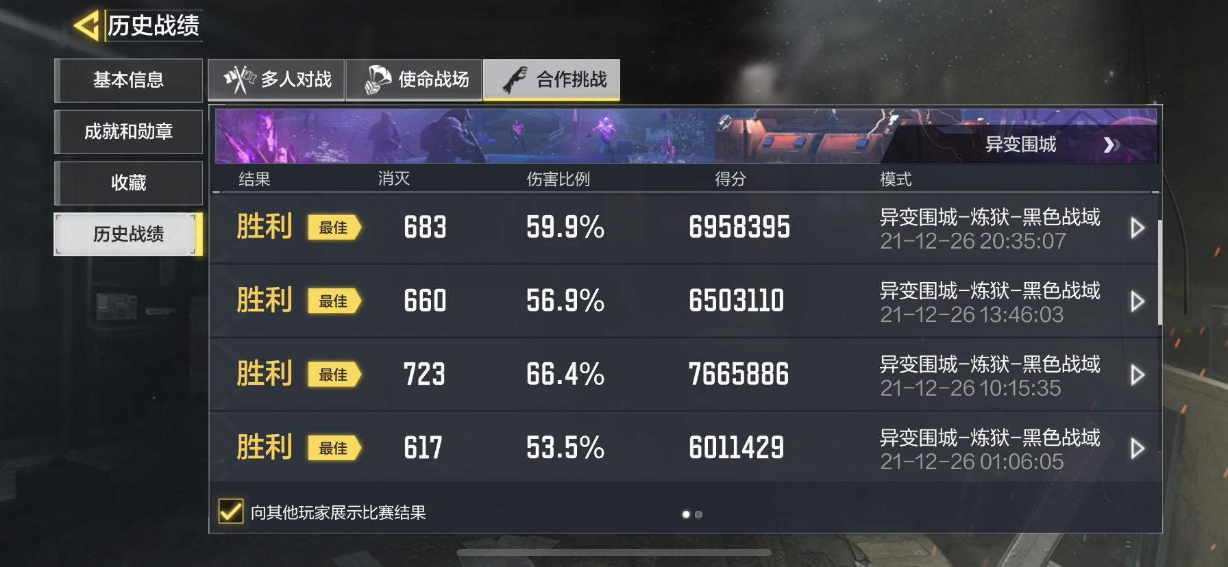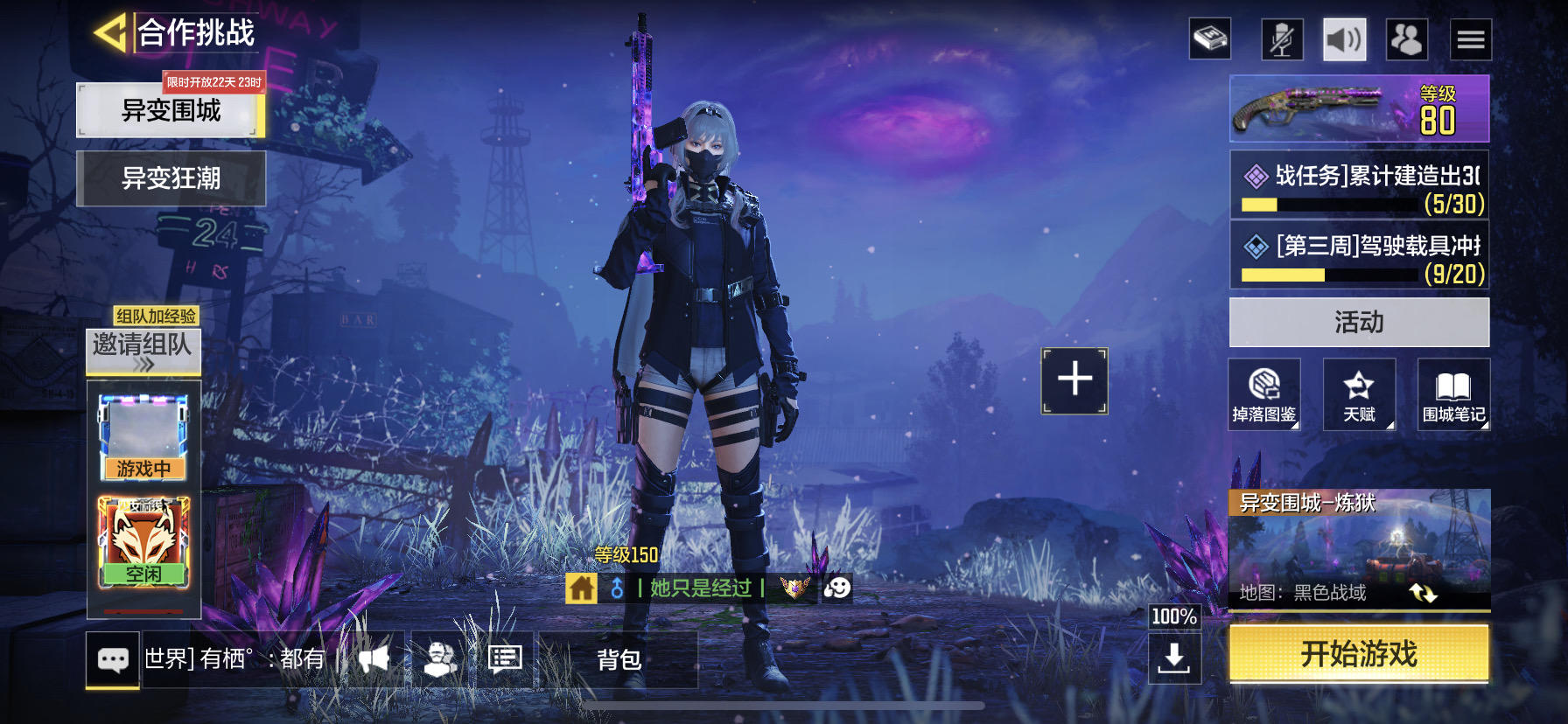 围城自从有一位大佬给我解答后就开始变得简单起来了,1拖没什么问题,期待新模式(无尽和更高级别的防御塔)模式挺不错的,就是天数偏少了,炼狱可以加两天,让大家都能做出传奇塔;另外就是基地旁边多加架飞机什么的,路上最好也能刷点车,毕竟要是车太少、队友想法不一样肯定要抢载具的。期待能成为常驻模式,开放新的难度(或者像狂潮一样一个人单开)。最后附上个人等级等级和部分战绩,祝游戏越来越好!