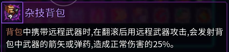 需要背包内携带远程武器且使用中的武器为远程武器。在翻滚后使用远程武器触发杂技背包(刺猬背包和犰狳背包是在翻滚时触发)
