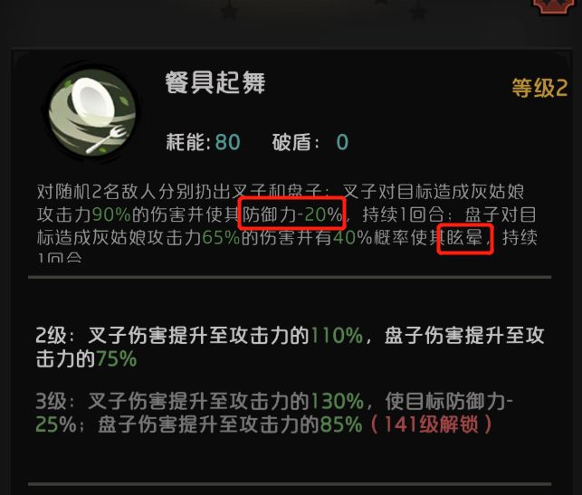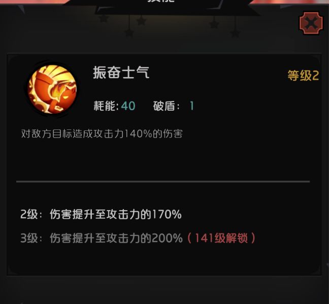 振奋士气40能耗200%伤害。。。啥概念,横向找一下,好像就没有比这个更高的了,一般到170%就很优秀了。