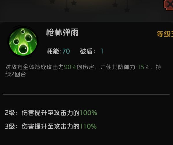 枪林弹雨,群体破盾+减防,也是很关键的伤害。