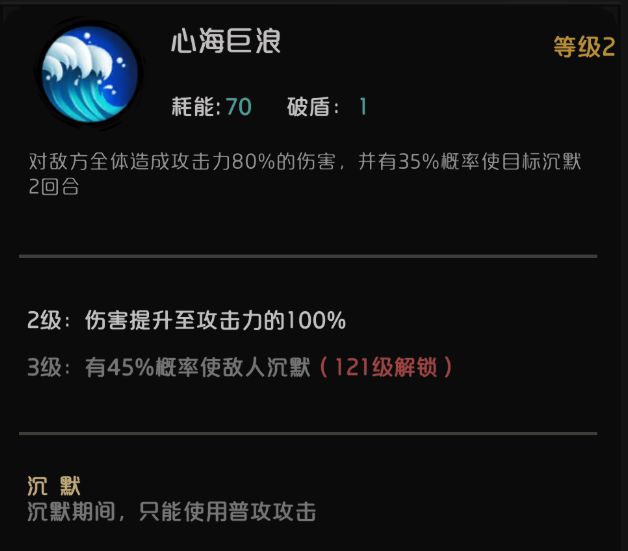 心海巨浪,45%全体沉默2回合,这个广泛应用于一些怪物群体技能变态的情况。美中不足这个45%概率不是百分百,有时候脸黑,一个不沉默,需要赌图。