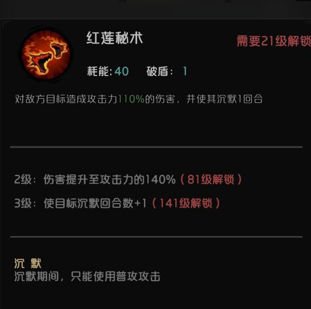 红莲秘术,40能耗稳定单体沉默2回合,对于一些图里面有技能强力的怪,强力推荐,可以解读成永远沉默一个敌方单位。
