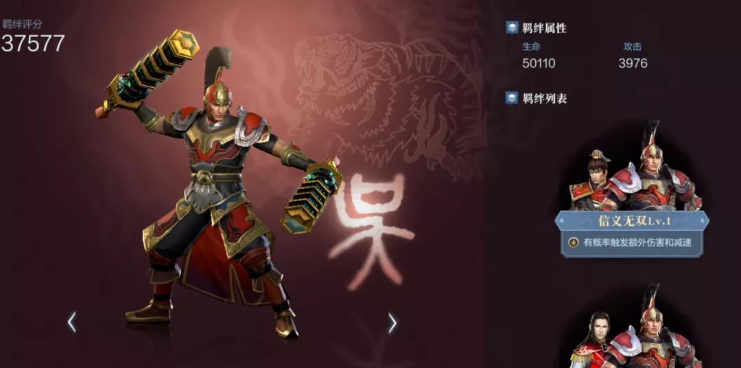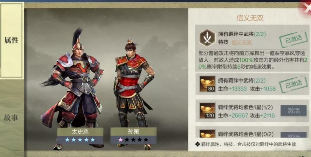 而【信义无双】则属于太史慈的核心羁绊,部分普通攻击有概率触发额外伤害并附带六秒减速效果,触发概率高而且没有冷却CD,能够大幅提升太史慈的伤害与黏人能力,在补充输出的同时并控制敌人,喜欢使用太史慈的小霸王一定要尽量解锁这一羁绊,能够让太史慈的实力更上一层楼!