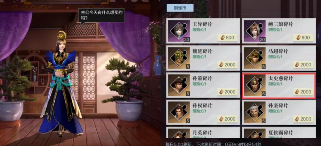 除了在武将招募中获得太史慈之外,还可以通过铜雀商店来兑换太史慈的武将碎片,而且每天都能刷新兑换次数,所以心动的小霸王们,可要多做任务获取铜雀币记得每天来兑换哦!