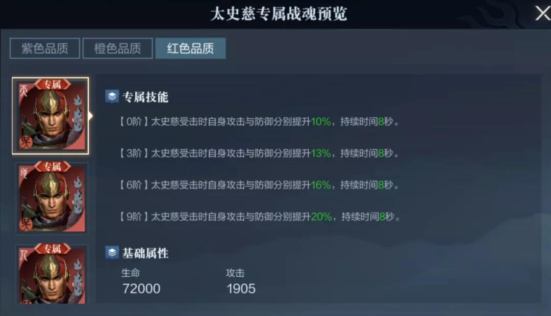 太史慈的专属战魂,分别为提升主动攻击威力的人魂,和提升被动受击增益的地魂和人魂。