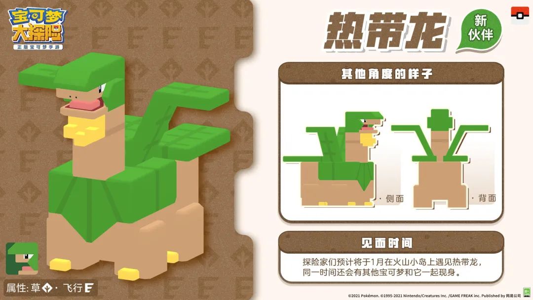 热带龙来自水果宝可梦,它的属性是草属性和飞行属性哟~