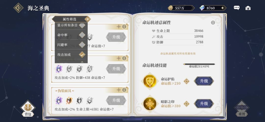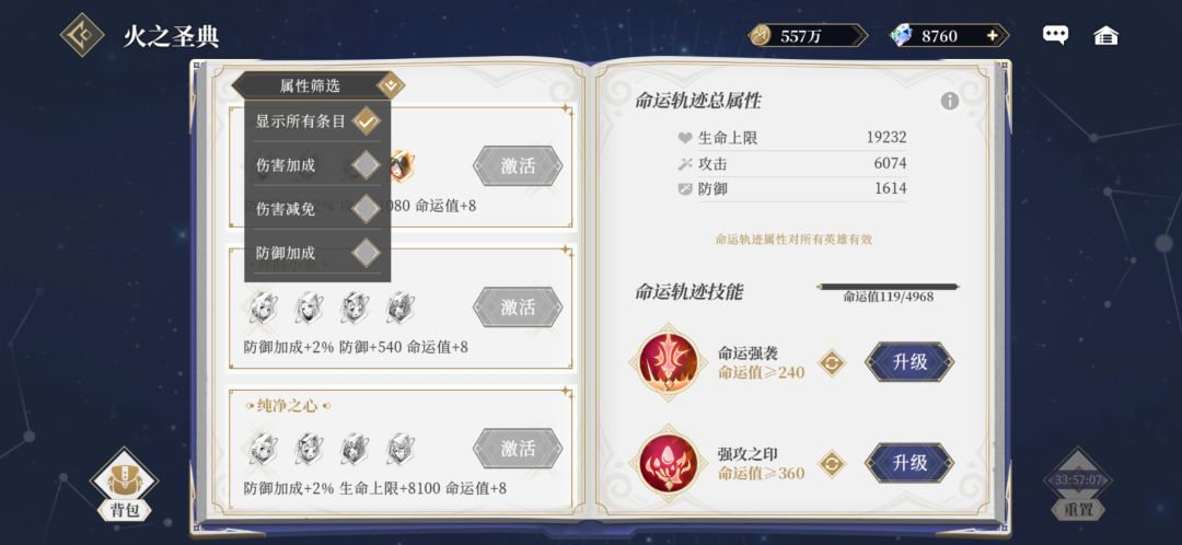 点完攻击加成,转回红书,优先点红书,其次蓝书,最后绿书,点完超级属性和攻击加成,就从红书给命运值最高的开始点,优先选择有攻击,伤害加成词条的点,要注意一点,不要攒星石不点,可能有些好的词条差一两个星石,可以去商店买或者买任选礼包,商场没命运币买,不想氪金的也不要留着不点,顺着找三本书,哪里亮着点哪里,都是加战力的,每三天可以重置一次,等你这三天收集了新的星石,重置后再点就好了。
