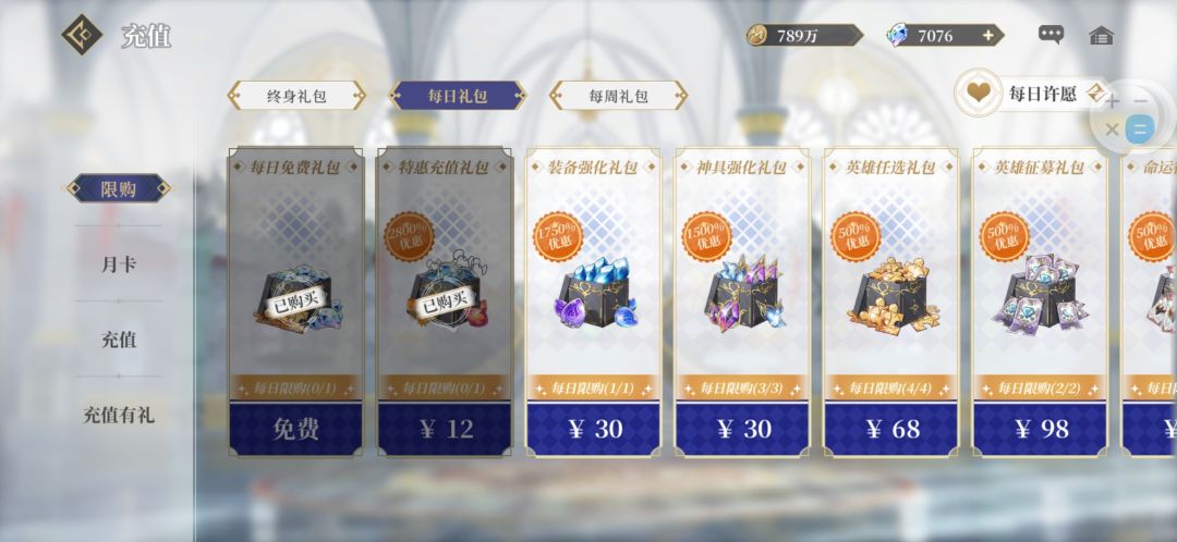 前期氪金点不多,有几个东西推荐优先购买 下面给图的推荐买,还有一个就是推图爬塔或者其他任务做完会弹出来的限时礼包,有条件就全拿了,里面有资源以及会反钻石,终身、每日、每周礼包都不会反钻石,然后不推荐花钱买钻石,及其浪费。