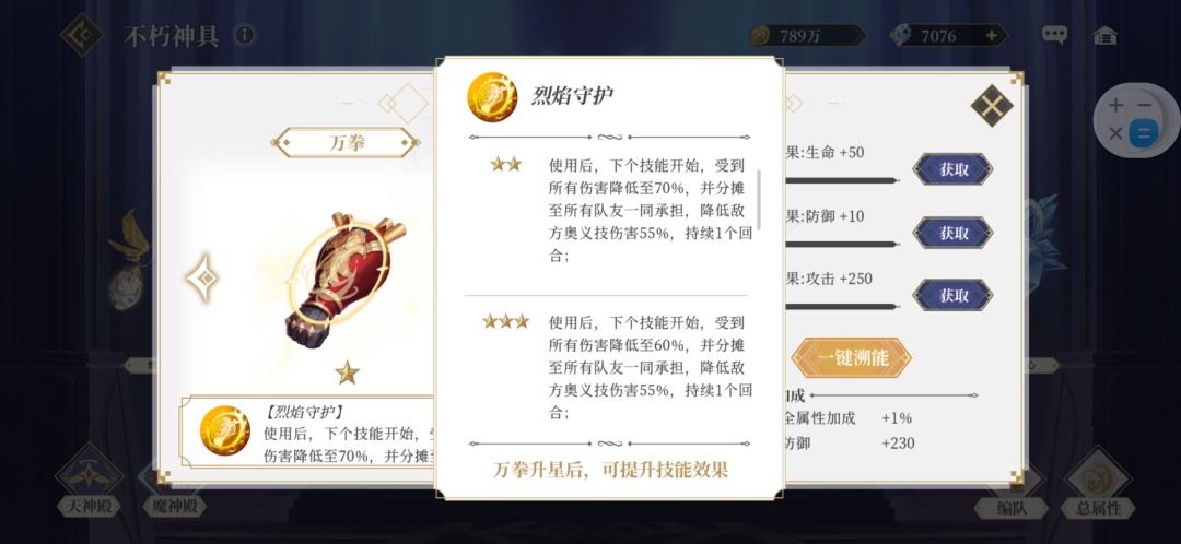 可以看一下神具升星的技能介绍,星级越高作用越好,竞技场pk的时候如果有高星神具往往能逆转局势。神具放置的位置代表了释放的先后顺序,左1右2。
