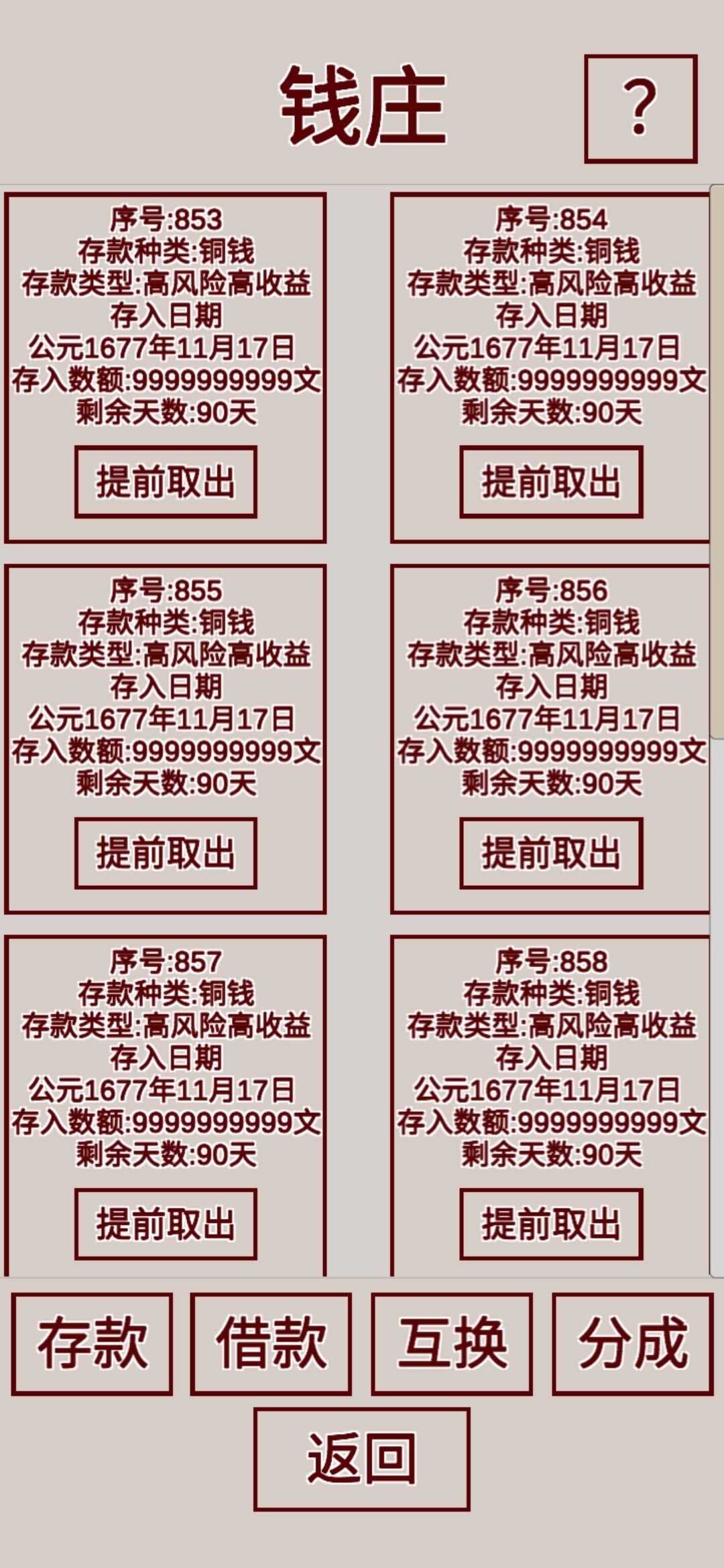 游戏最主要的赚钱方式就是往钱庄里存钱的功能,钱庄存钱最终目标一定是选高风险高收益90天(180-360天收益都是一样的),钱庄可以利用金钱积少成多的方式滚雪球(第一代家主开局务必把爵位刷最高官职最高,一个月差不多一万铜钱,第二代官职刷不刷无所谓)攒到20w开始存钱钱庄(高收益高风险)一年可以存3次,日复一日重复重复钱庄存钱操作,现实生活里刷一个钟左右(熬死了嘉庆熬死了万历,后面称帝不怕没钱),最重要的要记得等到了可以一次存钱99亿高风险高收益90天得到结算一次钱庄收益5亿一笔时,尽量在钱庄刷够10笔99亿高收益高风险存款,慢慢的一次收益达到50亿一次时多刷几次,下一步可以用作置办田产了(我的是50w亩管家管理),家族后代衣食无忧后代家主躺着刷年份从明末到清初会很爽。起义做帝王家,还不如做大明富商舒服,到时候如果有更新大航海时代玩法可以到海外搞万邦臣服,真香(好像记得开局选项选了爷爷是跟明太祖征战的将军,爸爸是富商,咱也不是吴三桂,就认大明做老东家了,所以我等到明灭了清上位再看心情推翻清揭竿起义)