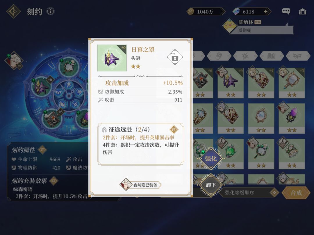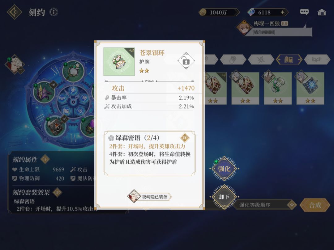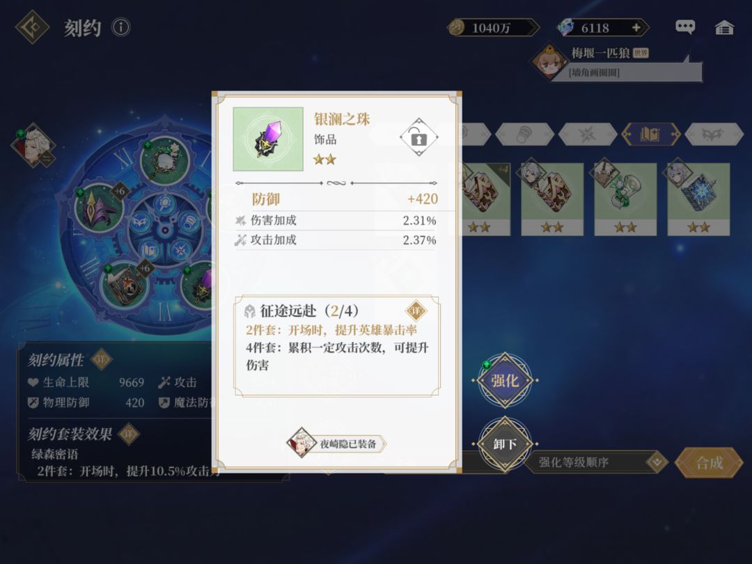何为2+2+1。即选择两件绿森蜜语(不一定是绿森蜜语,两件加攻击力的即可)+两件征途远赴(同理,加暴击率的即可)以及一件主属性适合夜歧隐的散件即可。