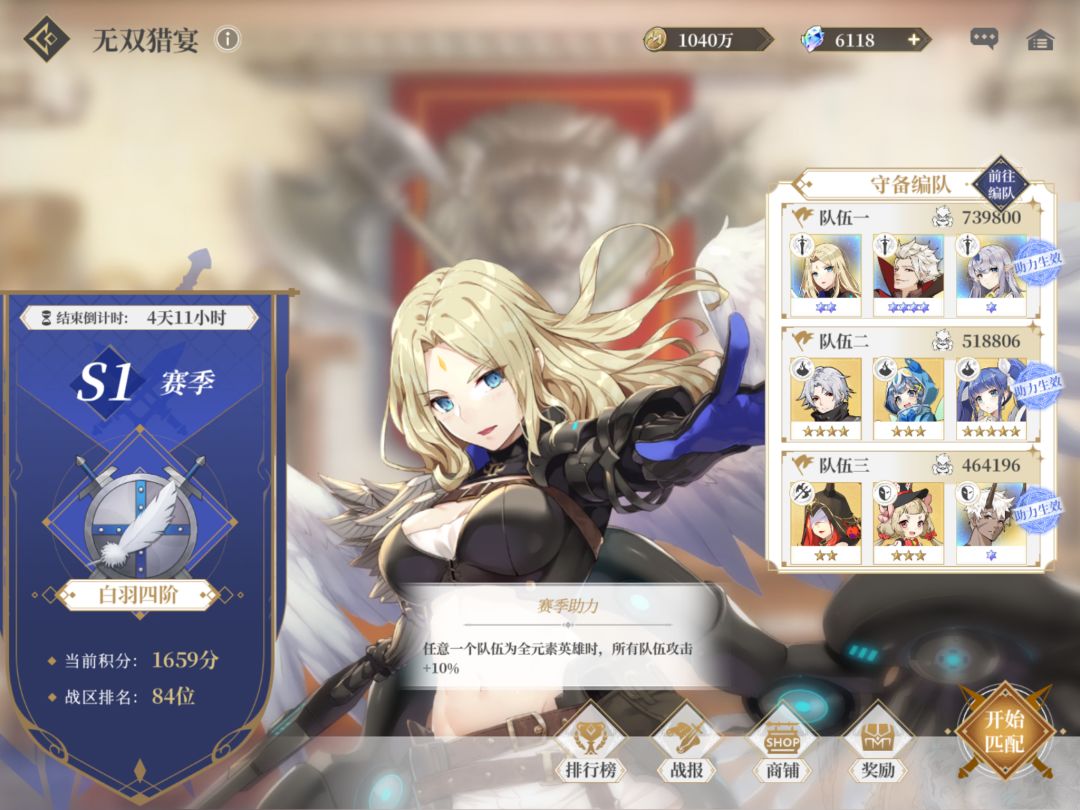 目前已开启无双猎宴(58级开启的新竞技场),会要求你使用三个队伍。