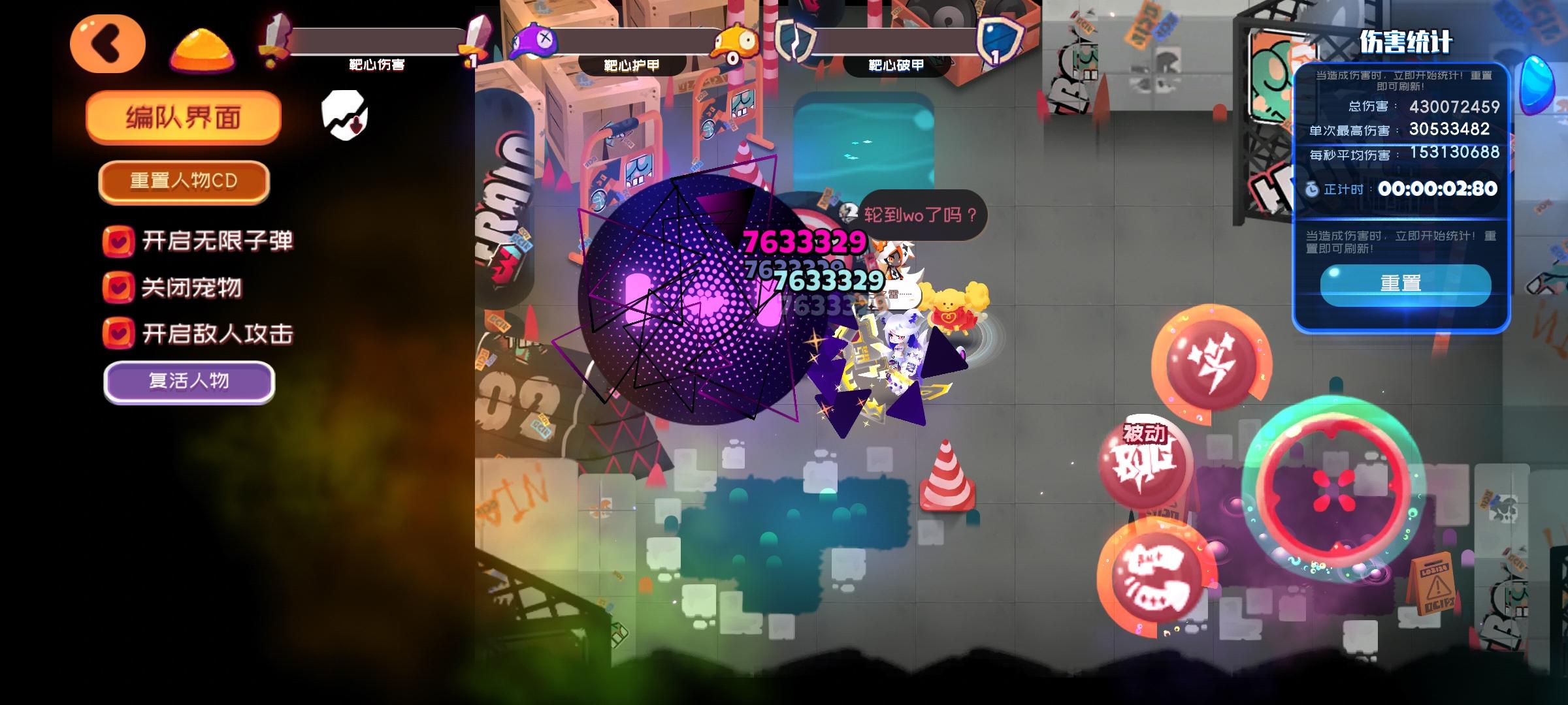 图5,同图4装备,buff全开,0护甲,maki爆出bug被动,最高单次输出3000万,最高秒伤1.5亿