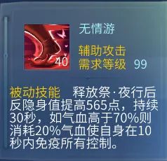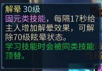 受到致死伤害时气血恢复百分比,移除所有负面状态,5秒内除石化、冰冻外控制抗增加,一定时间内触发一次。