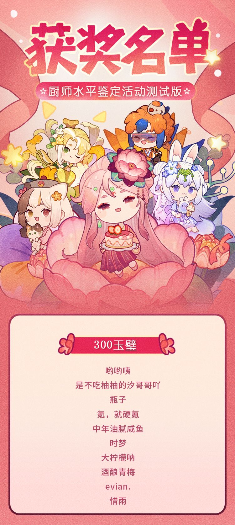测试活动期间得分最高的10位主厨将获得每人300玉璧福利!