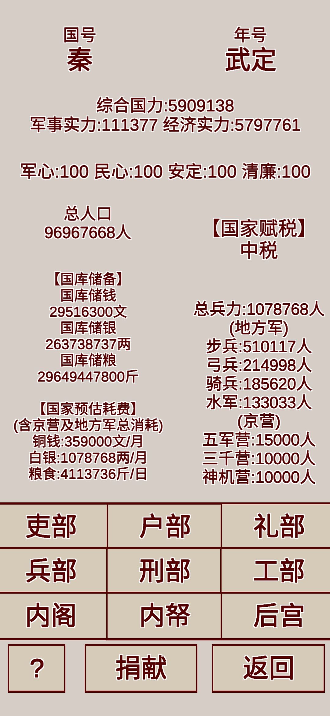 户部的主要作用是调整国家赋税 国库的粮食买卖以及赈济百姓(恢复地方民心2点一次需要50亿铜板以上点不起!)国家赋税点中税就行 高税会掉地方民心(每年30点!!!)赋税越低地方民心恢复的越多。粮食买卖最大的作用就是缺银子卖粮食 缺粮食在用银子买回来稳定国家