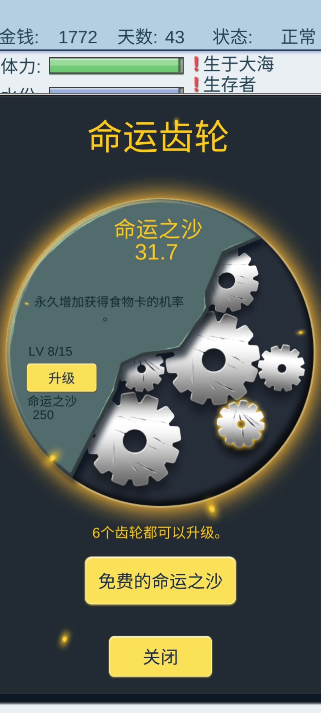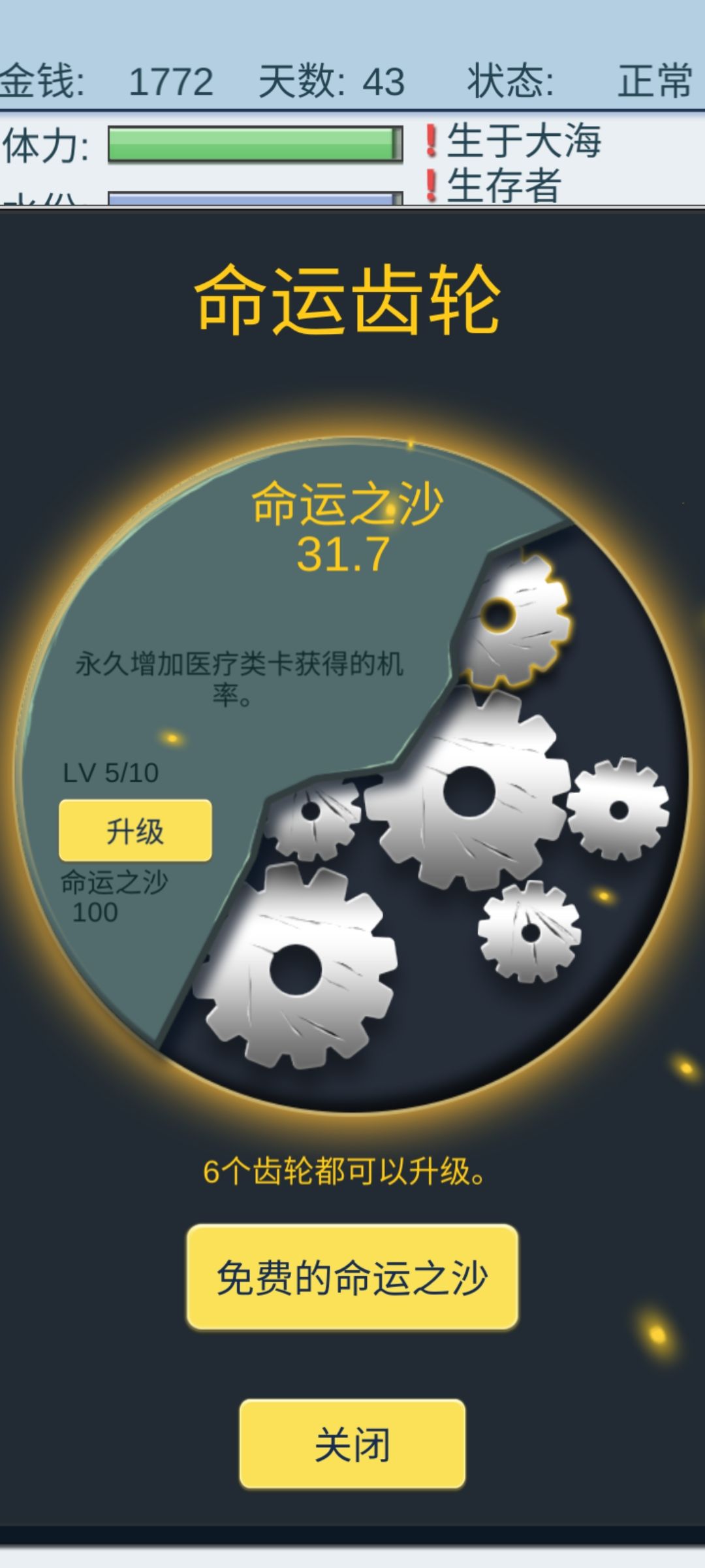 半小时前战战兢兢经营只为通关,苟到300多天96张SSR,就差4张,崩了。半小时后找到了永动机😃,离谱,钱越刷越多,手都点麻了。齿轮等级不高都是升的100块即以下的。永动机核心:精神强,大生存者,商店价格高且有镇定剂买。